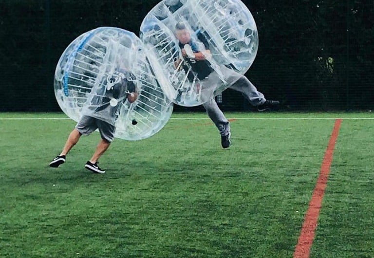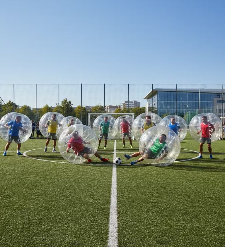 El Bubble Football es una versión del fútbol mucho más loca y divertida. Cada jugador se mete dentro de una gran burbuja inflable transparente que cubre el cuerpo, dejando solo las piernas libres para correr y chutar el balón. ¿El resultado? Choques, rebotes y caídas que hacen que cada partido sea una auténtica risa.